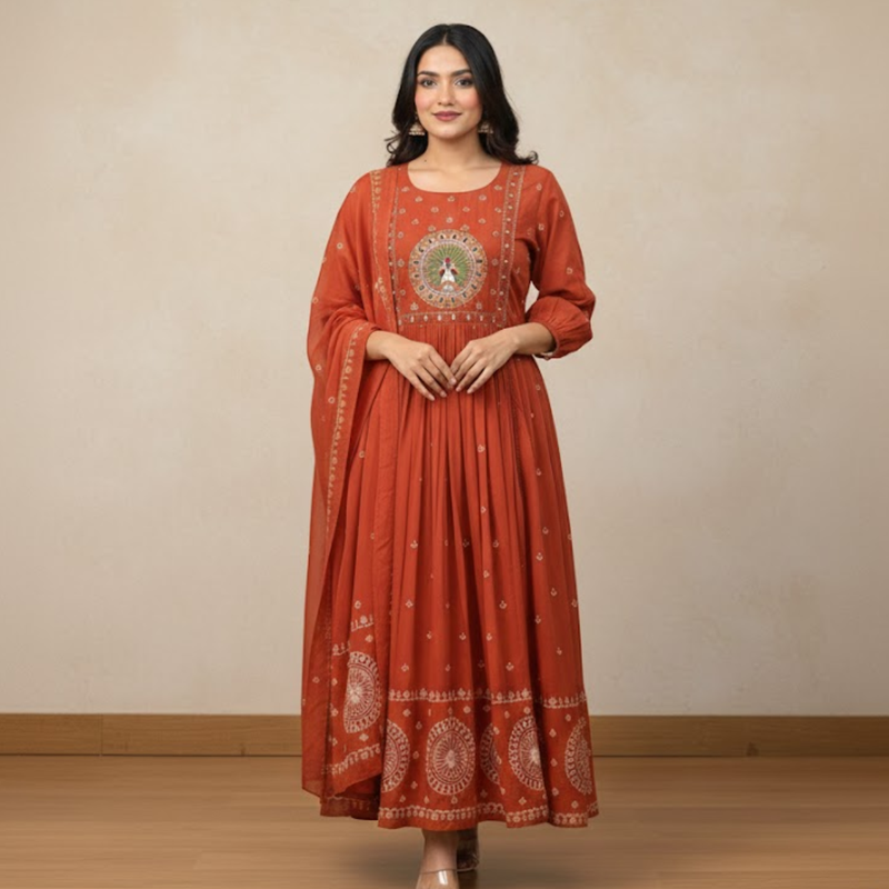 Vibrant Rust Anarkali Suit With Embroidered Dupatta